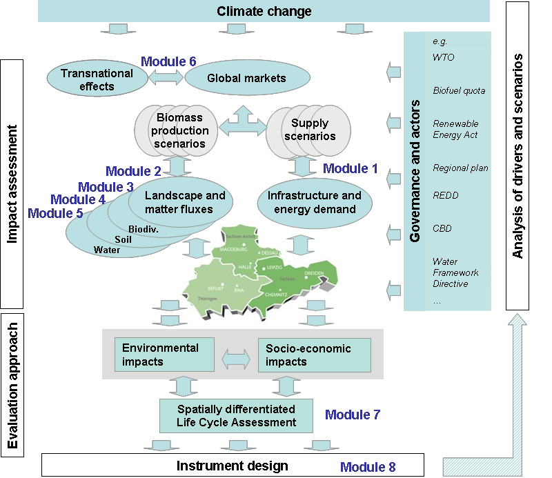 Acht eng miteinander verzahnte Forschungsmodule haben dabei eine neue, umfassende Form der Bioenergiesystemanalyse ermöglicht, die in dieser Form bislang nicht praktiziert wurde. Alle Arbeiten wurden eng mit den systemanalytischen Forschungsfeldern am UFZ verknüpft.