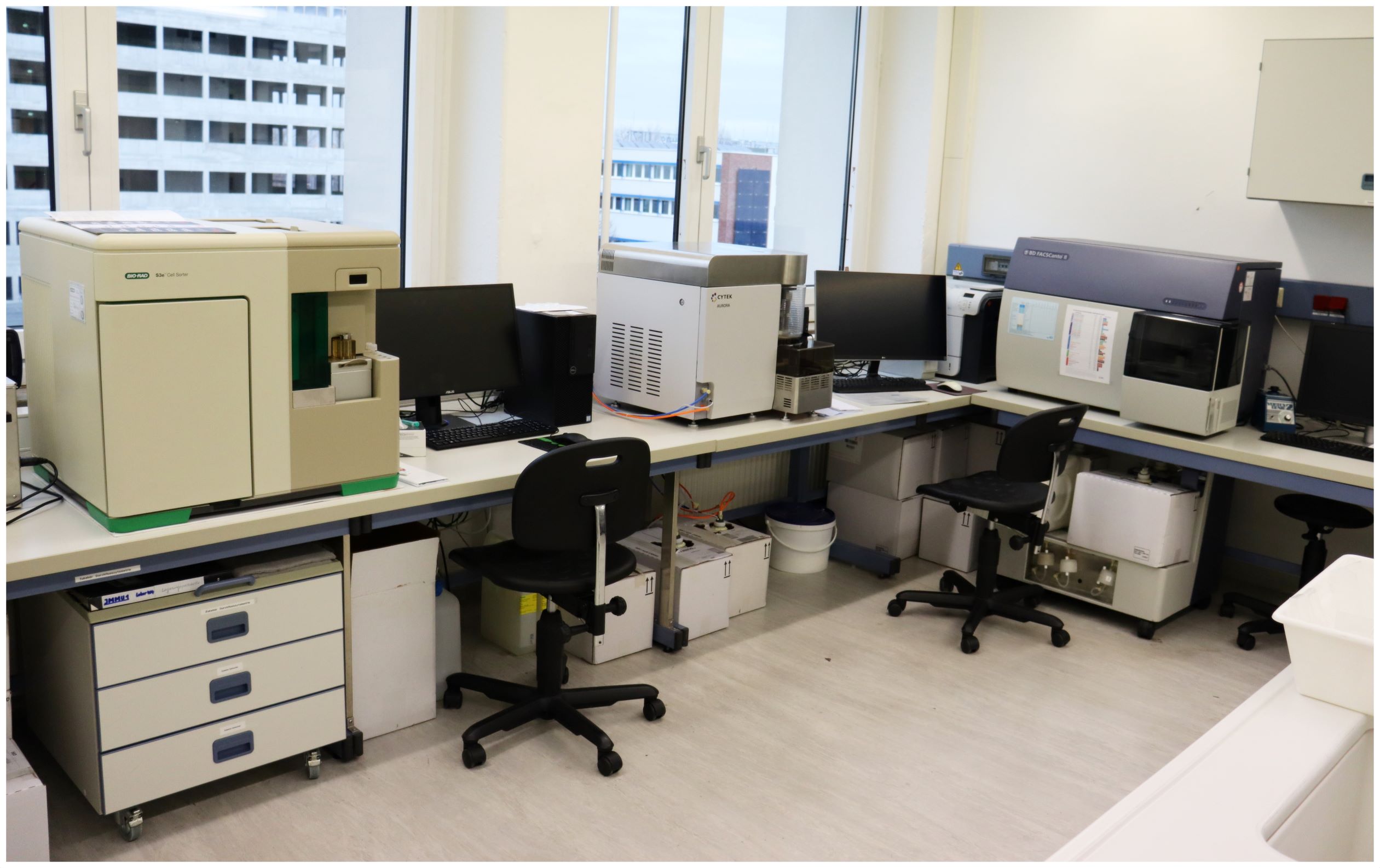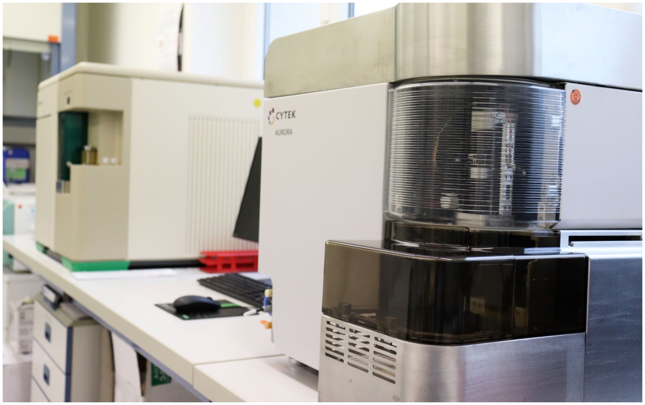 Bei unserer Plattform "Durchflusszytometrie" wenden wir durchflusszytometrische Methoden für die Charakterisierung von Immunzellen an. Unser Ziel ist es, sowohl durch Oberflächen- als auch durch intrazelluläre Färbung die betrachteten Immunzellen darzustellen. Es ist uns gelungen, Antikörper-Panels mit mehr als 20 Farbstoffen für die Charakterisierung von humanen Immunzellen zu etablieren, wodurch nur noch sehr geringe Probenmengen benötigt werden. Die Messungen werden mit Geräten, die auf dem neusten Stand der Forschung sind (z. B. drei Laser CYTEK Aurora Vollspektrum-Durchflusszytometer), durchgeführt. Die betrachteten Immunzellen können wir mit unserem BioRad S3e Cell Sorter unter der Nutzung von bis zu vier Fluoreszenzkanälen isolieren. Unsere Färbeprotokolle werden kontinuierlich weiterentwickelt, um einen detaillierten Aktivierungsstatus der Immunzellen zu erfassen (Zytokinproduktion, Transkriptionsfaktoren, mRNA Experssion, Phospho-flow). Wir haben neue Methoden etabliert, um den Einfluss von Chemikalien aus der Umwelt und von Mikroorganismen, wie Bakterien und Viren, auf die Aktivierung von Immunzellsubtypen, wie T-Helferzellen (z. B. regulatorische T-Zellen) und zytotoxische T-Zellen (z. B. Mukosa-assoziierte invarinate T-Zellen), zu bewerten. Für die Datenanalyse und Präsentation nutzen wir die professionellen Softwares FlowJo und FlowLogic.