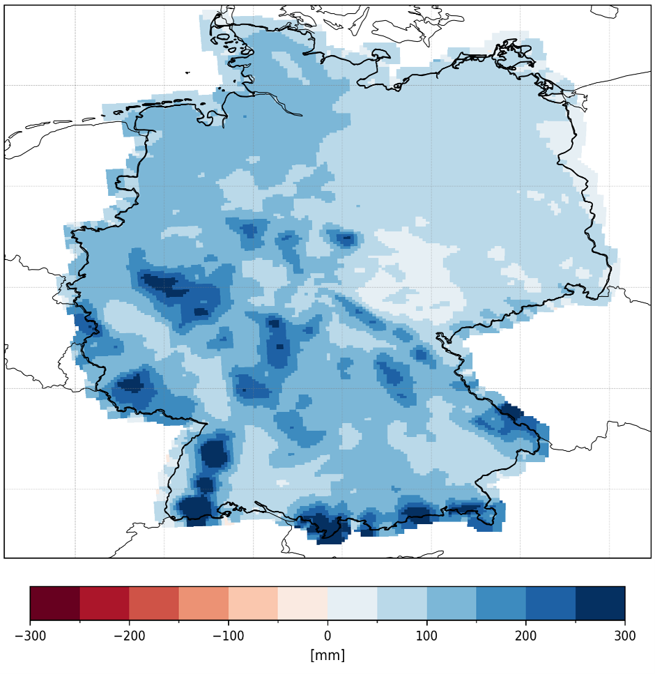Abbildung 1: Atmosphärische Wasserbilanz (Niederschlag minus Verdunstung) für den meteorologischen Winter 2025/26. Die Wasserbilanz ist positiv, da die Verdunstung im Winter eine untergeordnete Rolle spielt und wesentlich geringer als der Niederschlag ist. Quelle: UFZ-Dürremonitor.