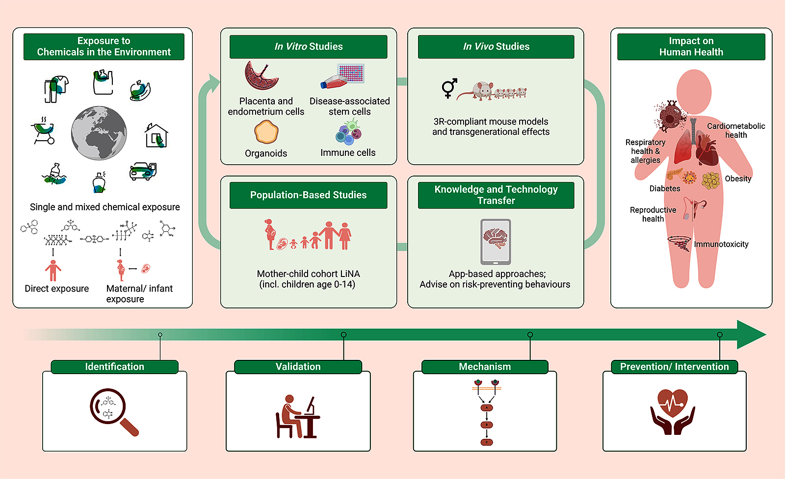 The time in the maternal womb is a critical stage for the development of an individuum and the placenta plays a superordinate role during this period. This unique organ of fetal origin represents the feto-maternal symbiosis. It transports blood and nutrients from the mother to the fetus and secretes hormones that support pregnancy and modulate the maternal immune system to tolerate the semiallogeneic fetus and support fetal well-being. The maternal adaptive immune system is essential for the development of tolerance towards the fetus during pregnancy and for maintaining the immunological balance between mother and child. The maternal innate immune system primarily overtakes tasks in the tissue remodelling and angiogenesis so that the placenta can work at its maximal potential and thus supply the fetus with sufficient nutrients. Not only the placenta is a target for environmental chemicals acting as a depot for substances that can be further passed through the fetus but also both arms of the immune system can be negatively affected by environmental chemicals, further leading to dysregulations and deviations of normal development. The effects of these dysregulations can be seen years later, even in adulthood. We address the impact of environmental stressors including environmental chemicals in sensitive time windows by means of population-based cohort studies, in vitro and in vivo models. Our population-based cohort studies are LISAplus Study, a multicentric German birth cohort, and the LINA Study, our own Mother-Child-cohort. Using samples and information obtained from these cohorts, we establish associations between environmental exposure and disease outcomes. If there are indications from the cohort studies of disease risks caused by certain chemicals or pollutants, cell-based, complex vitro models are further designed and employed to confirm the association, elucidate the underlying molecular mechanisms and to identify dysregulated signal pathways. In addition, we use state-of-the-art ´in vivo models to investigate the effects of environmental factors alone and in combination with other stressors and how they contribute to disease pathogenesis.