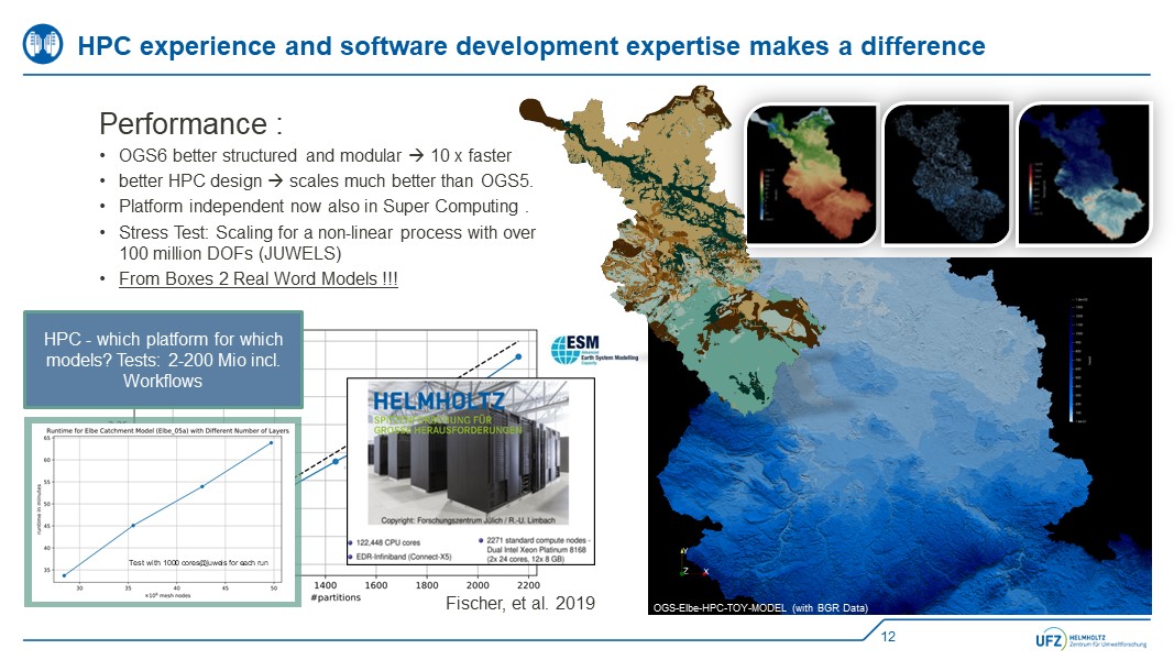 The open source platform OpenGeoSys.org, which is currently being organized at the Department of Environmental Informatics of the UFZ, plays a central role in our development. OpenGeoSys is also our most used simulation tool for the system analysis of hydrogeosystems. Many methods are implemented in this platform and we benefit from the quality control and automatic benchmarking provided by the OGS core development team. A large part of the methods and products developed by us can therefore be found as downloads for different operating systems inside the OpenGeoSys Software Packages offered for download: