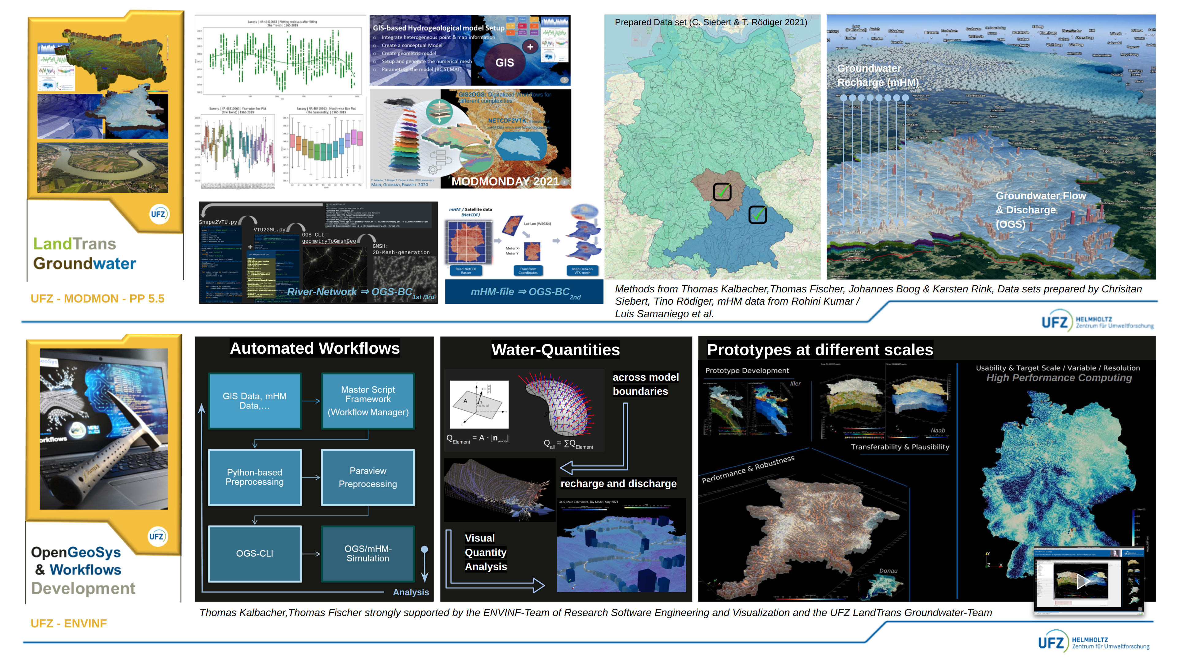 The ENVINF-Hydroinformatic developer group focuses on method and software development for the process-based modelling and parameterization of coupled surface, soil and groundwater systems, as well as the transport of dissolved substances, flow with variable density, or mechanical changes in aquifer systems due to changing environmental impacts. Our work supports various scientific projects and research initiatives, many of them with a strong focus on process and software coupling as for example within LandTrans, LISA and TiM4Water.
