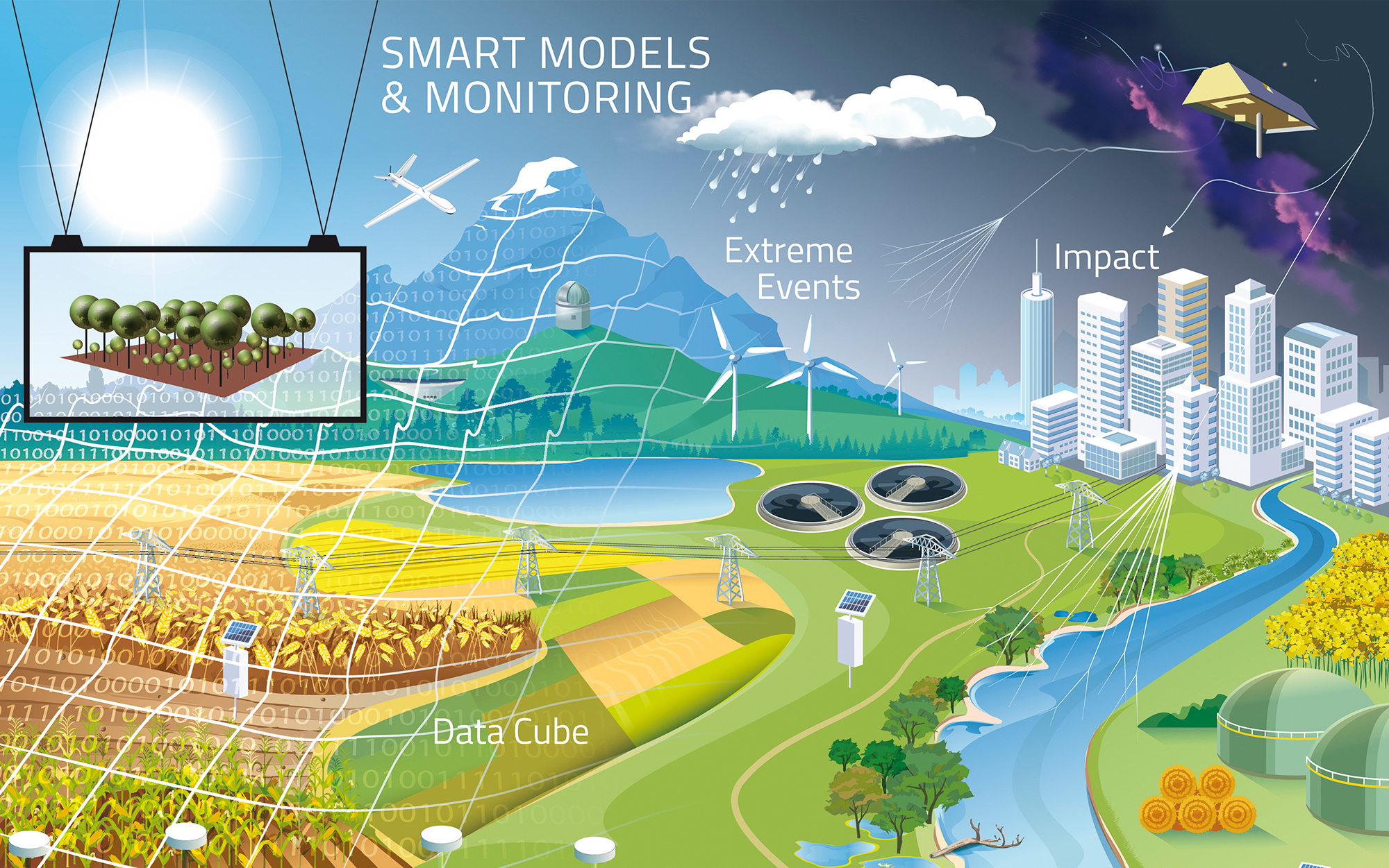 The required large-scale predictions come along with challenges: (i) mechanistic soundness; (ii) adequate consideration of heterogeneity in environmental conditions at a resolution which matches the operational needs of the targeted decision-makers; (iii) complex interplay of hydrological, ecological, and socio-economic processes which are traditionally modeled in isolation; (iv) incorporation of scenarios of climate change and altered landscape management. This requires a new generation of terrestrial environmental models which are more integrated and allow large-scale simulations at an operationally relevant resolution. Parameterizing and validating these models is another challenge. It can be overcome by linking these models to novel geo-referenced data from earth observation (esp. remote sensing) and applying data science. The development of appropriate concepts, methods, tools, and workflows is the core of the IP-research. They are applied in close collaboration with other, more content-oriented IPs to provide the desired “pictures of the future” for various use cases.